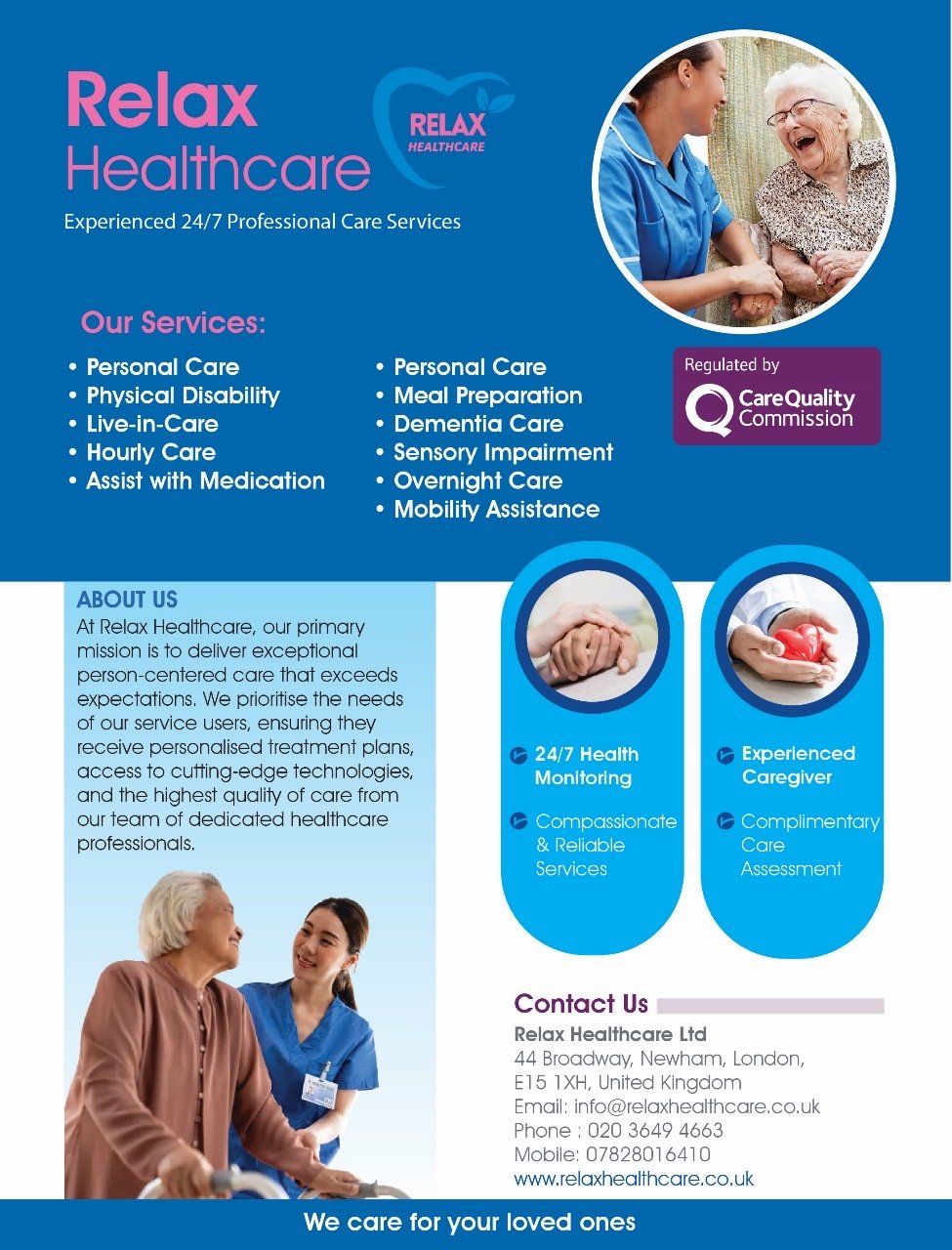 Relax Healthcare Limited is a registered domiciliary care provider, currently delivering services within the London Boroughs of Newham and Tower Hamlets. As we continue to grow, our vision is to extend our reach to additional boroughs across London. At Relax Healthcare Limited, our primary aim is to excel across every facet of our operations. We are dedicated to strengthening our reputation for delivering outstanding quality, distinguishing ourselves from other domiciliary care providers by upholding the highest standards of care, professionalism, and integrity in all that we do. This commitment includes maintaining a thoughtful and effective balance between the needs of our clients, staff, stakeholders, suppliers, and regulatory bodies.